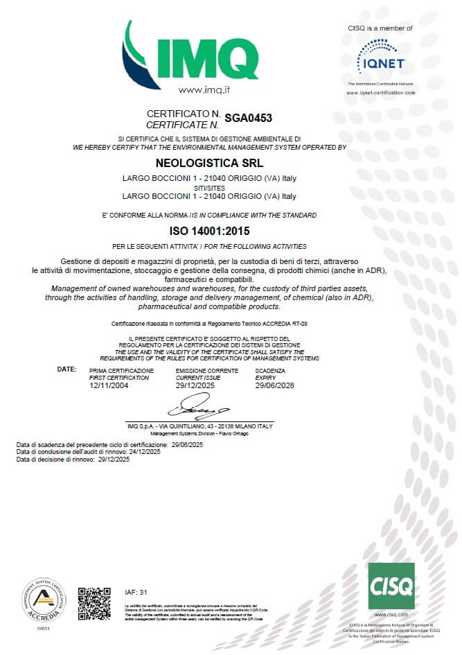 Neologistica si contraddistingue per essere un’azienda logistica certificata, grazie al possesso delle più importanti certificazioni in ambito della qualità, del risparmio energetico, del rispetto dell’ambiente e della sicurezza dei lavoratori.
